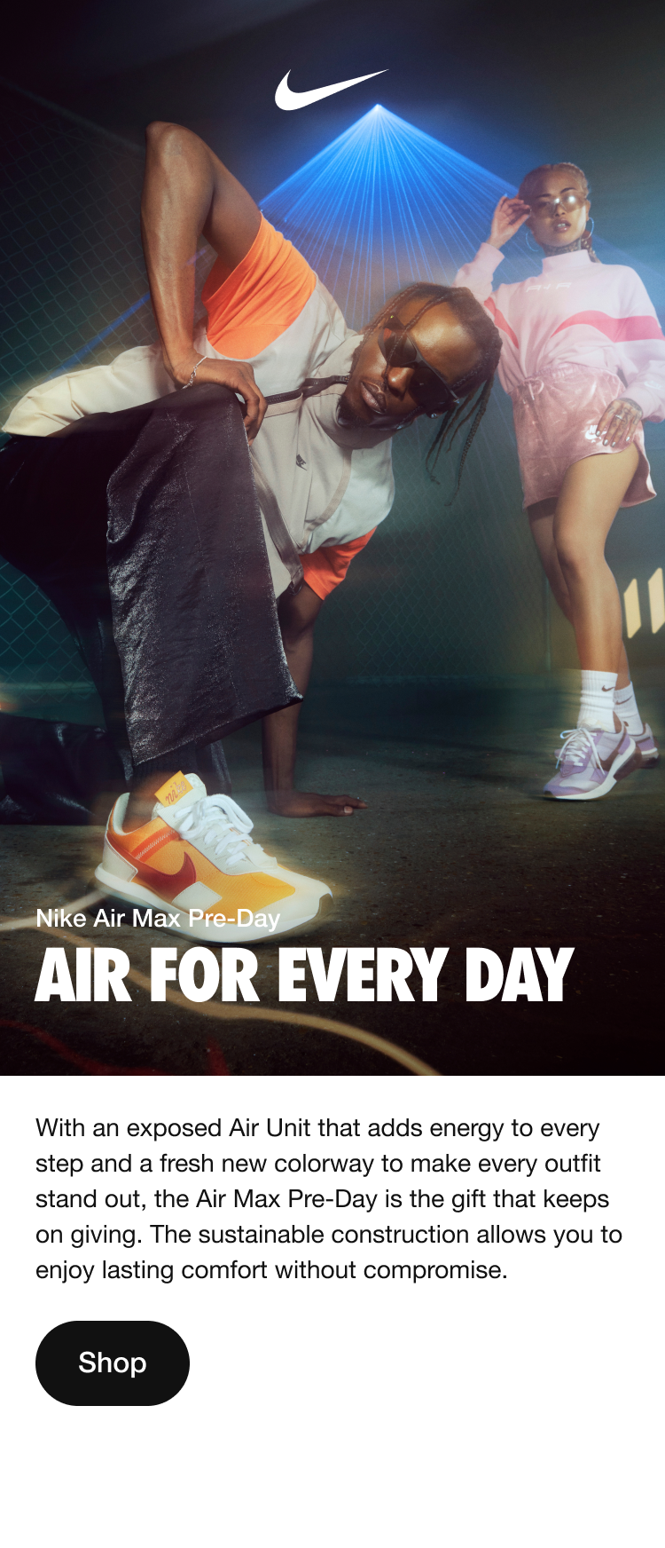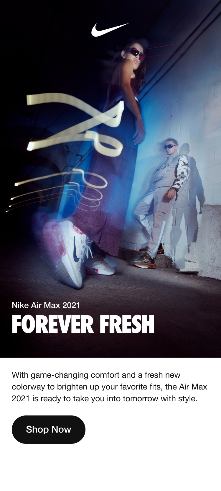 The Future is in the Air campaign for Holiday of 2021 revolved around the release of the Air Max Dawn, Air Max Pre-Day, and Air Max 2021. This campaign was a digital marketing effort that hinged on future-forward designs with art direction to match.